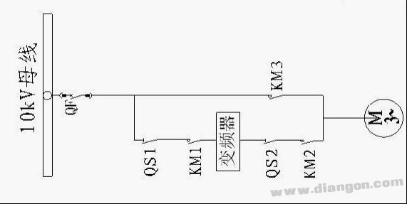 上述手动切换方式由三个隔离开关QS1、QS2和QS3组成,其中QS2和QS3不能同时合上,在机械上互锁。当变频器运行时,QS1、QS2合上,QS3断开;当变频器故障时自动跳开上级开关QF;断开QS1和QS2,合上QS3之后合上上级开关QF,电机进入工频运行。