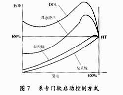 消除喘振现象的控制方法如图7所示,电动机的转速-转矩曲线已经修改成泵系统相关特性。这种特性可提供尽可能接近恒定的加速转矩。同时不需要转速表、流量或压力传感器、或其它类型的外部反馈到控制器,而是利用基于微处理器的电动机反馈来完成的。由于没有突然的转矩变化、因此电动机平滑地加速,泵系统的喘振或冲击达到最小。