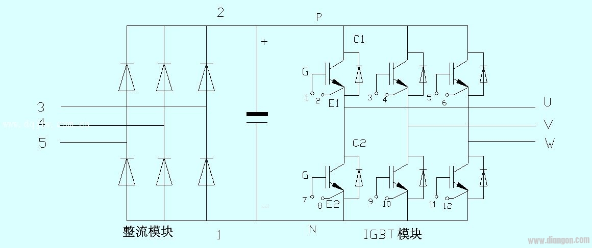 以德国eupec 25a/1200v六相igbt模块为例,(参见附图)。将负载侧u、v、w相的导线拆除,使用二极管测试档,红表笔接p(集电极c1),黑表笔依次 u、v、w(发射极e1),万用表显示数值为最大;将表笔反过来,黑表笔接p,红表笔 u、v、w,万用表显示数值为400左右。再将红表笔接n(发射极e2),黑表笔 u、v、w,万用表显示数值为400左右;黑表笔接n,红表笔 u、v、w(集电极c2),万用表显示数值为最大。各相之间的正反向特性应相同,若出现差别说明igbt模块性能变差,应予更换。igbt模块损坏时,只有击穿短路情况出现。