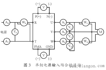 变频器的电源侧、输出侧的电压、电流因为含有高频成分,所以测量仪表和测量回路不同,所得到的数据也是不同的。用工频仪表测量时,三相电源输入场合的连接如图2 所示,单相电源输入场合的连接如图3 所示。