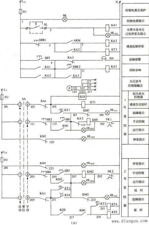 当系统用水量减小到使变频器的输出频率低于某一设定值时,控制器KGS使2号泵控制回路中的211与217号线断开,时间继电器KT2线圈失电释放,随后KT4线圈也失电,KT4断电延时的常开触头延时断开,即211 207点断开,使KM2线圈失电,其主触头断开,定速泵电动机M2停止运转,使供水量与用水量匹配。