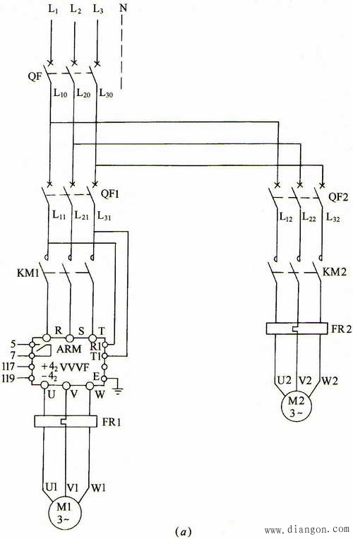 当变速泵M1在工作过程中出现故障时,变频器VVVF中的电接点ARM闭合,接通5 7点,使中间继电器KA2线圈通电吸合并自锁,1 9点接通,警铃HA响,同时时间继电器KT3通电,经过预定的时间延时后,KT3的动合触头延时闭合,接通211 207点,使接触器KM2线圈得电,KM2的主触头动作闭合,定速泵电动机M2启动运转。