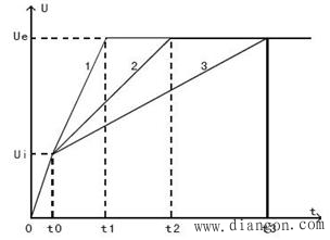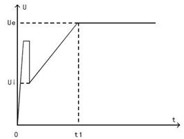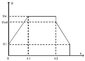 2、 电压斜坡起动 指输出电压按预先设定的斜坡线性上升,即电压由小到大斜坡线性上升,它是将传统的降压起动从有级变成了无级。主要用在重载起动,它的缺点是初始转矩小,转矩特性抛物线型上升对拖动系统不利,且起动时间长对电动机不利。如图(2)所示。