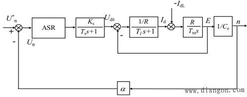 由动态结构图知:电网电压扰动在电流环之内,电压扰动尚未影响到转速前就已经为电流环所抑制。因而双环系统中电网电压扰动引起的动态速降(升)比单环小得多。