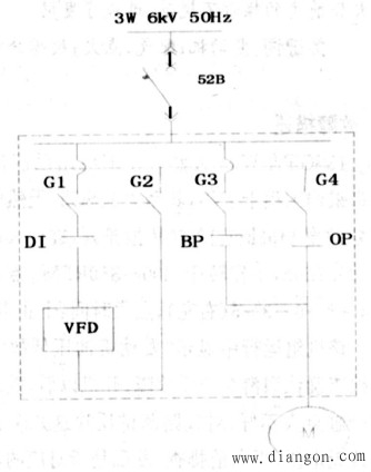 该系统结构配置中主要设备选用罗克维尔Pow er Flex 7000 变频器, 成套控制几台机组时, 需要配置双冗余PLC 及通讯模块。该控制系统的正常运行方式是首先操作变频器柜上隔离开关G1、G2、G3、G4 合闸, 操作中压柜断路器52B 合闸, 合上变频器柜内真空接触器DI, 变频器上电自检, 按起动按钮变频回路真空接触器OP 吸合, 同时变频器起动输出, 通过改变调速信号改变变频器的输出频率调整电动机转速。当变频器故障发出跳闸信号真空接触器DI 释放, 工频旁路真空接触器BP 自动吸合,实现变频与工频的不停机切换。该方式优点是可靠性高, 切换时间很短, 变频器与工频旁路切换相当于不间断切换, 变频器可以脱离电源维修、更换部件等, 缺点是系统配置结构复杂、造价高。