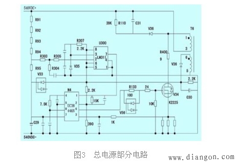 检查处理(参见图3):检查底板:主开关电源开关管V34(K2225)栅极限流电阻R133(100Ω和24Ω)电阻烧坏,测量N4(3844)PWM集成块,3脚过流保护外接电阻由正常时的100Ω变为400kΩ,更换后,运行正常。