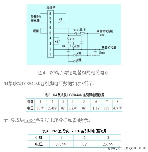 检查处理(参见图4、图3、图2):检查底板,测量K4继电器线圈并联续流二极管V20,与K4线圈串接二极管V16击穿短路,测N7电源块L7824损坏,N4集成块UC3844AN 1脚对地电阻500Ω,正常值应为15kΩ。更换同型号二极管2支、N4集成块UC3844AN、N7电源块L7824后,测试各点电压正常。