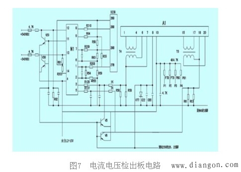 检查处理(参见图7):检查电流电压的检测部分运算放大器N1(TL084)集成块第7脚的输出外接电阻R209,电阻值由正常时的47Ω变为888kΩ,第14脚输出外接电阻R203,电阻值由正常值47Ω变为185kΩ,更换新电阻后,正常。