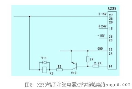 检查处理(参见图8、图7):检查,上电,自检完成后,内部继电器K3吸一下就跳,连接X9的7点与9点闭合一下马上断开(K3的常开点外接主电路接触器线圈)测量各点输出电压正常,断电测量电流检测板A1的第4脚与第6脚之间的电阻值为2140Ω,正常电阻值为3200Ω,更换电流检测板后,运行正常。