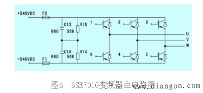 检查处理:检查底板,25A正负熔断器F1、F2全部熔断(见图6),测量IGBT模块输出端U相与V相之间,电阻值为11Ω,已经短路,(正常阻值应该为210kΩ),IGBT模块触发部分触发板A12、A32、A22的3脚与4脚和7脚、5脚、8脚的电阻值变为1.9Ω,已经短路。更换同型号六单元IGBT模块(型号为BSM15G120DN12)与触发电路板A12、A32、A22后,恢复接线,变频器上电,测量各个电源输出电压正常,IGBT模块6个触发电路脚电压为-5.1V,正常,显示正常。