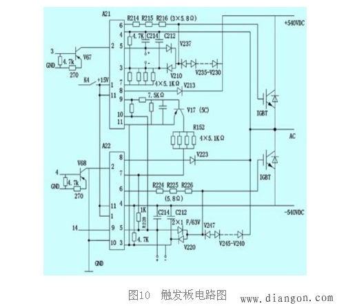 检查处理(参见图10):检查变频器底板,测量各点电压正常,未发现问题,后来将IGBT模块、触发电路板A21、三极管V17(5C)、各个管脚重新焊接后,运行正常。