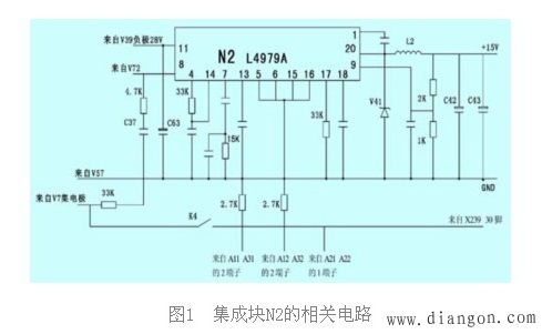 检查处理(参见图1、图2、图4):检查底板电源块N2(L4974A)第1脚的开机电压为11.32V,正常值为26.7V;第20脚输出电压为0.117V,正常值为15.31V;基准电压块N3(MC340)第1脚电压为0.315V,正常值为2.1V;第2脚的电压值在1.5~1.8V之间变化,而正常值为5.1V。检查继电器K4,线圈电路串联两支二极管V16、V15,电阻值分别为3.67Ω和5.5Ω,已经短路,V28(5C)三极管基极电阻由正常值4.7KΩ变为150kΩ,已经烧坏。更换新的电阻和二极管后,运行正常。