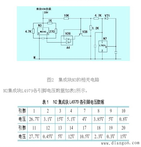 检查处理(参见图3、图1、图2):检查底板V34场效应管K2225,发现栅极保护贴片电阻24Ω变值为500kΩ,已损坏。检测N2集成块的20脚无电压,1脚为11.3V,N3集成块MC340脚为4V,2脚为3.3V。用热风枪将N3集成块MC340拆下测量1脚与3脚之间的阻值变为9kΩ,正常应为500kΩ。更换新的N3集成块MC340和24Ω贴片电阻。上电测试N2、N3集成块各引脚电压,正常。恢复接线,运行正常。