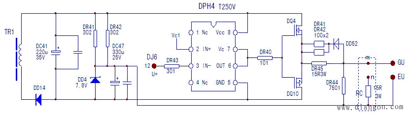B、驱动IC内部输出电路不良或后置放大器DQ4、DQ10导通内阻变大等。如带载后检测电源电压无低落现象,检测T250输出电压偏低,则为T250不良,否则更换DQ4、DQ10等元件。DR40、DR45等阻值变大的现象比较少见。