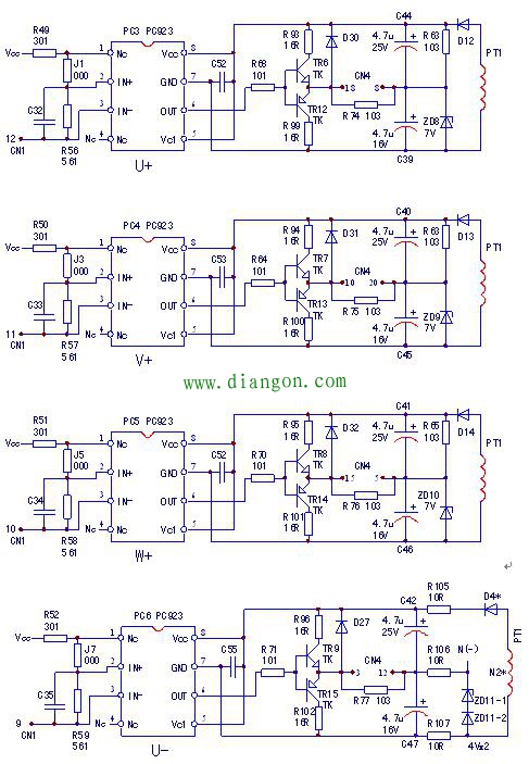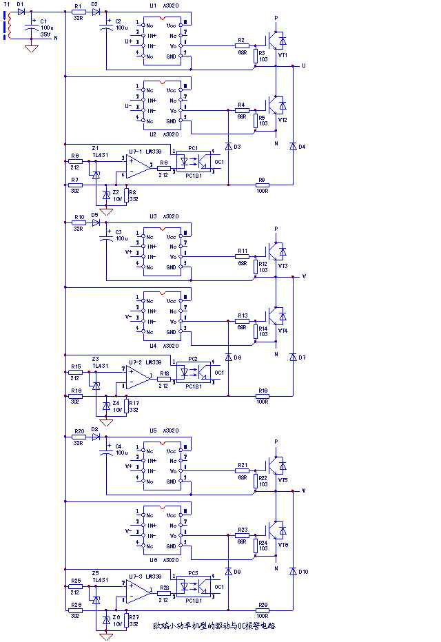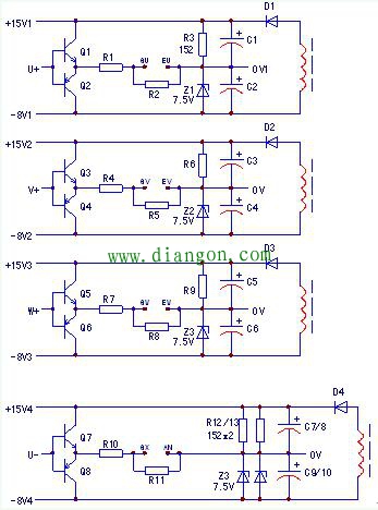 如图所示。U+、V+、W+三路脉冲的信号回路无法共地,故采用三路独立供电电源;而U-、V-、W-因信号地共N端,因而可共用一路驱动电源+15V4、-8V4。