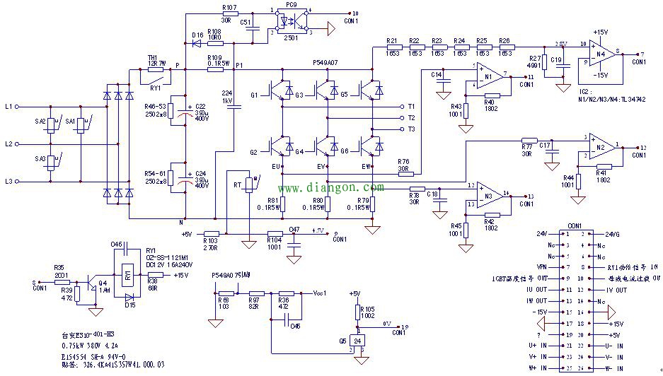 N1~N3为三相输出电流前级检测电路,是18倍的同相放大器。停机或空载状态时,输出电压信号应为0V。