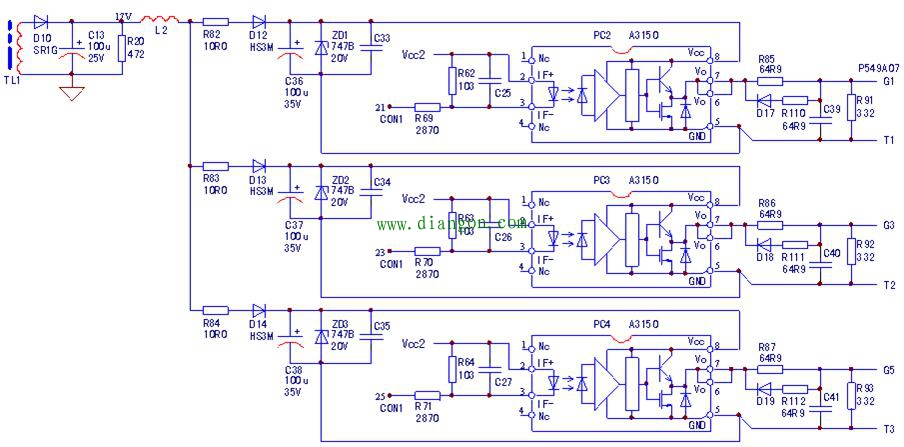 三路驱动共用一路供电电源,其中D12、D13、D14为高速高反压(耐压需1000以上)隔离二极管,C36\37\38为自举电容。当相应下臂IGBT开通时,上臂驱动电路才产生供电条件,IGBT才有开通基础。静态检测PC2等状态,供电电压为零。若与逆变电路已脱开联系,此时可将PC2的5脚与供电地暂时短接,为PC2提供电源进行检测驱动电路的好坏。