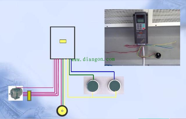 变频器输出端子(U、V、W)应按正确相序连接至电动机,在变频器上已经给出的接线中,有3条颜色相同软线,将这3条线通过接线端子与电动机相连。