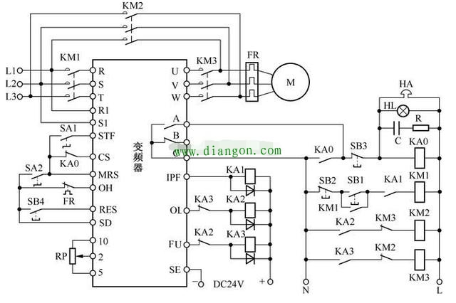 KA3线圈得电→KA3常开触点闭合一接触器KM3线圈得电→KM3主触点闭合,KM3常闭辅助触点断开→KM3主触点闭合将电动机与变频器输出端连接;KM3常闭辅助触点断开,使KM2线圈无法得电,实现KM2、KM3之间的互锁(KM2、KM3线圈不能同时得电),电动机无法由变频和工频同时供电。