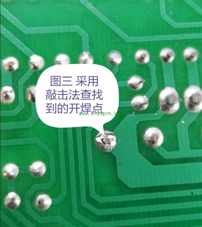 敲这种方法是针对第四种检测方法的补充,毕竟第四种方法仅能对小型的贴片元件行之有效,而对于部分大功率电子元器件或者存在高压危险的线路部分则不太方便操作。对此我们可改压为敲,利用绝缘工具在怀疑故障点附近适当用力敲击,大多数情况下是能快速锁定故障对象的。图三展示的为,用该种方法检测到的引发某小容量变频器间歇报超压故障的元件虚焊点!