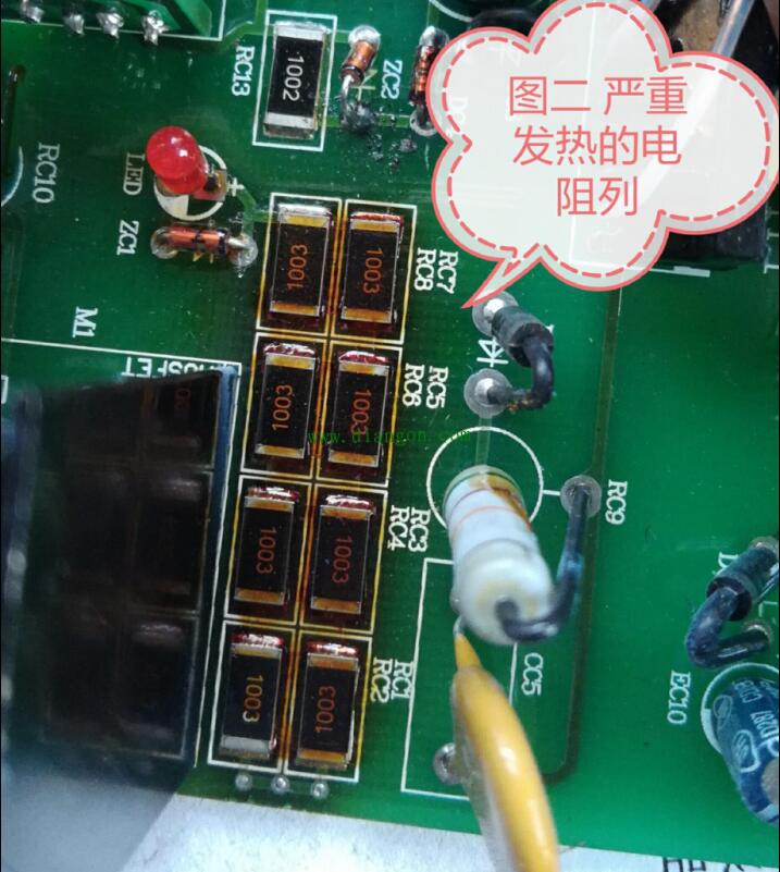 在变频器出现故障断电后,迅速拆机并做好防护工作用手指肚快速触摸变频器内部线路板上的相关电子元器件、IC集成块等。一旦发现某些元件同比温升明显,则故障必在它身上或者其周围线路当中!图二展示的为某品牌35KW变频器,因直流母线电压监测电阻阻值变质而引发直流母线过电压保护,从图中可感觉到事发时电阻所散发出的热量有多高!