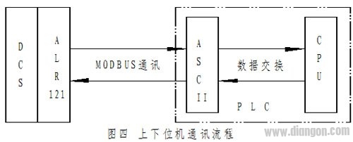 网络采用RS485串行接口,通信媒体由4芯屏蔽电缆连接主从设备,传输距离最大达1.5Km,全双工,串口设定波特率19200,8位数据位、偶校验、1位停止位。DCS通信部分采用横河型号为ALR121的通信模块,并配套横河提供的Modbus通信软件包,该通信模块最大通信数据容量4000字。PLC通信部分则采用Omron的C200H-ASCII 21可编程特殊单元模块(以下简称ASCII模块),该模块支持BASIC语言编程,内有200K字节的程序存储区,配备RS232、RS485通信串口各一个。通过对该模块的编程,可实现与外围设备的各种通信。本系统通过ASCII模块与DCS基于Modbus协议的通信,将DCS的读、写指令及数据做相应转换,并与PLC的CPU单元进行数据存取交换,以实现上下位机控制信息的实时传输。如图四所示。