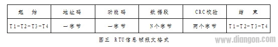 Modbus协议有两种传输模式:ASCII模式和RTU模式。同波特率下,RTU模式较ASCII模式能传输更多的数据,所以工业网络大都采用RTU模式。RTU模式下的信息传输报文格式如图三