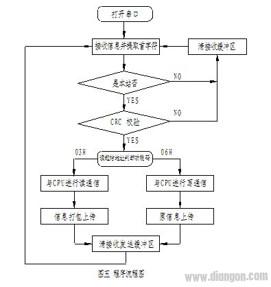 ASCII模块支持BASIC语言编程,此外,又附加了多条系统及函数指令,如接收、发送缓冲区操作指令、信息传输差错控制CRC、LRC校验函数指令和与CPU单元数据交换的读写指令等。编程使用WINDOWS操作系统上附带的Hyperterminal(超级终端)软件,通过此软件,PC机可与连接在网络上的其它PC机或串口终端设备进行文本文件的传输及显示。编程时,将PC机串口与ASCII模块的RS232串口连接,运行该软件,就能在其界面上对ASCII模块进行程序编写、上传、下载和调试等工作。也可先通过WINDOWS系统的写字板编写程序,并保存为文本格式,然后再通过Hyperterminal将程序下载到ASCII模块。通信程序的主工作流程见图五。