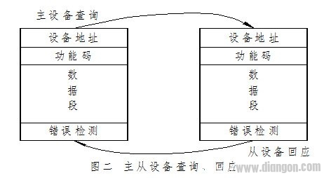 Modbus协议是一种适用于工业控制领域的主从式串口通讯协议,它采用查询通讯方式进行主从设备的信息传输,可寻址1-247个设备地址范围。协议包括广播查询和单独设备查询两种方式,二者区别就是广播查询不需要从设备回应信息,主从设备查询通讯过程见图二。