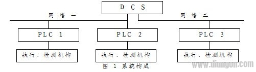 本系统构成如图1,其中略去了现场仪表信号的采集、控制部分。系统上位机采用横河CS3000型DCS集散控制系统,对整个生产过程进行集中监控;下位机采用Omron的CS1H系列PLC,分布在3个电气控制室,负责现场电机、OCV阀、流量开关、变频器等执行、检测机构的启停控制、反馈信号采集、故障判断等操作。