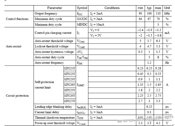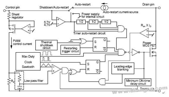 电路简单归简单,你还是想弄清IC11――MIP0223SC这只电源模块的来龙去脉――电路是如何工作的,弄不通这一点,电路倒真是简单得太没劲了。下面看IC11的原理图资料表(又是英文的,没办法,中文的难找):
