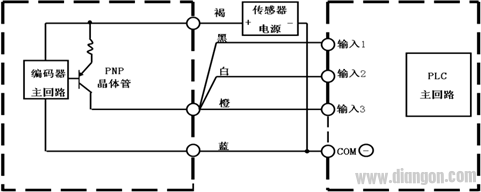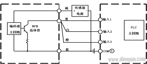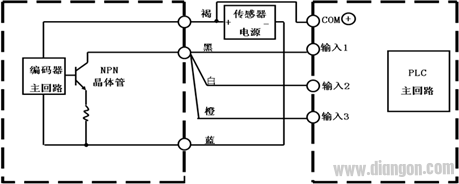 编码器的褐线接电源正极,输出线依次接入PLC的输入点,蓝线接电源负极,再从电源正极端拉根线接入PLC输入com端。