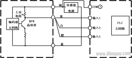 这种接线方式应用于当传感器的工作电压与PLC的输入电压不同时,取编码器晶体管部分,另外串入电源,以无电压形式接入PLC。但是需要注意的是,外接电源的电压必须在DC30V以下,开关容量每相35mA以下,超过这个工作电压,则编码器内部可能会发生损坏。