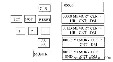 plc 首次上电后,编程器上显示出“PASSWORD ! " (口令)字样,依此按下CLR 和MONTR 键(回答口令)至口令消失后,再按CLR 键,待编程器上显示出00000 时方可进行下面的操作。