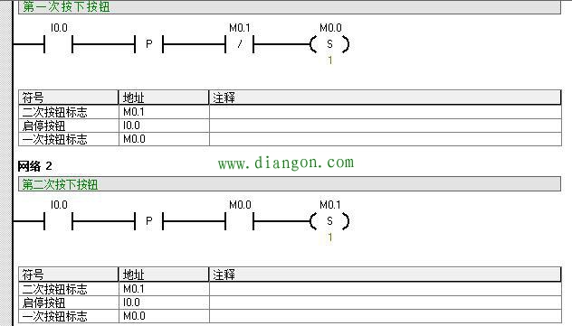 当第一次按下按钮时候,网络1 置位M0.0就导通了,网络2和网络3中M0.0常开点闭合,同时网络四接通Q0.0,同样,当第二次按下按钮时候,网络2的M0.1导通,同时网络3 M0.0和M0.1导通,复位M0.0和M0.1线圈。大家有机会自己编写好程序,自己链接上PLC就可以去试一试。当然西门子还有其他方法可以实现,那就是用计数器指令,也可以实现一键启停。我就在里过多废话了。