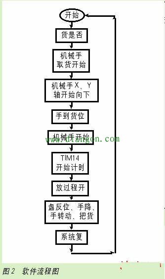 其工作过程为:当货物到达时,机械手系统开始动作;步进电机控制开始向下运动,同时另一路步进电机控制横轴开始向前运动;伺服电机驱动机械手旋转到达正好抓取货物的方位处,然后充气,机械手夹住货物。