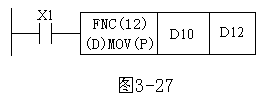 功能指令可处理16位数据或32位数据。处理32位数据的指令是在助记符前加“D”标志,无此标志即为处理16位数据的指令。注意32位计数器(C200~C255)的一个软元件为32位,不可作为处理16位数据指令的操作数使用。如图3-27所示,若MOV指令前面带“D”,则当X1接通时,执行D11D10→D13D12(32位)。在使用32位数据时建议使用首编号为偶数的操作数,不容易出错。