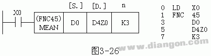 图1中源操作数为D0、D1、D2,目标操作数为D4Z0(Z0为变址寄存器),K3表示有3个数,当X0接通时,执行的操作为[(D0)+(D1)+(D2)]÷3→(D4Z0),如果Z0的内容为20,则运算结果送入D24中。