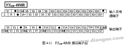 FX2N-48MR的输入输出端子如图4-11所示。传感器采用三线式的接近开关,电容式、电感式、光电式均可。在操作叙述中以光电开关为例。