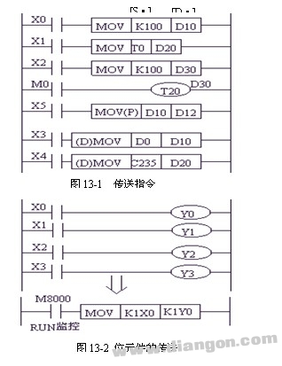 如图13-2所示,可用MOV指令等效实现由X0~X3对Y0~Y3的顺序控制。