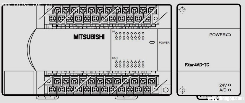 在温度控制系统中,电加热器加热,温度用热电耦检测,与热电耦型温度传感器匹配的模拟量输入模块 FX2N-4AD-TC将温度转换为数字输出,CPU将检测的温度与温度设定值比较,通过