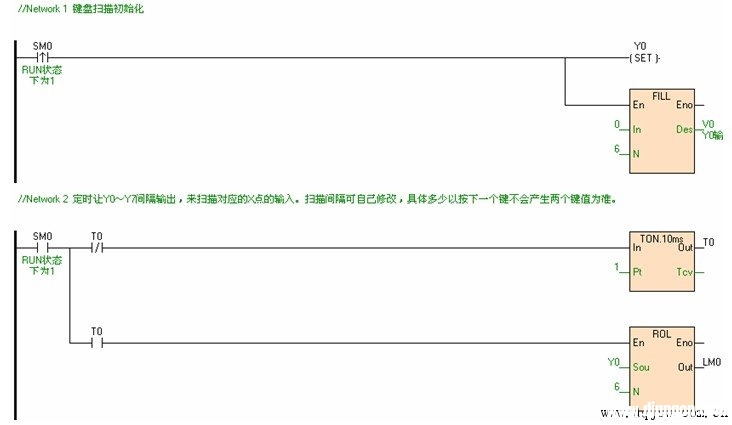 扫描的点是令Y0~Y5循环输出,当有按钮按下时,就会做出相应的动作,例如:当按钮键0按下时,则X0接通,当程序扫描到Y0时,X0与Y0形成一个回路, 表示按键“0”按下。程序如下图所示: