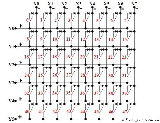 下面是用三菱plc编程软件编写的8乘6的48键扫描程序。需要用到8个输入点,6个输出点,硬件连接如下图所示: