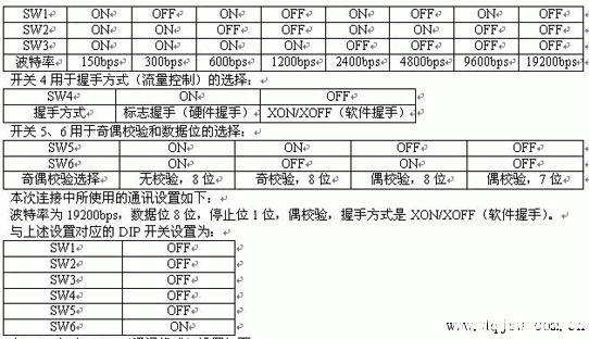 对象: ① FX2N plc + FX2N-232-BD ② TPuP-A系列微型面板式打印机(uP-A16S) 在串口打印机的控制板上有一个DIP开关,用于对串行口的参数进行设定。其中: 开关1、2、3用于波特率的设定:   下面的PLC程序通过使用RS指令(FNC. 80)实现打印以下格式文字的功能(当X0接通时): MITSUBISHI ELECTRIC 其中,利用ESC/P(EPSON打印标准代码)指令生成一个空格。指令的格式为:ESC f m n 当m=0时,该指令将生成n个空格。 当m=1时,该指令将生成n行空行。 因此,要生成一个空格可以使用以下指令: ESC f 0 1  |