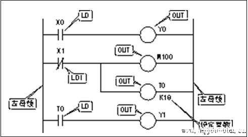 图2是由AND、ANI指令组成的梯形图。OUT指令之后可通过触头对其他线圈使用OUT指令,称为纵向输出或连续输出。例在OUT M101指令后,可通过触头T1对线圈Y4使用OUT进行连续输出,如果顺序不错,可多次重复使用连续输出。
