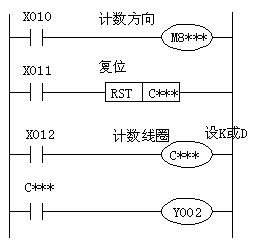 |  0 LD X010 1 OUT M8*** 2步 3 LD X011 4 RST C*** 2步 6 LD XO12 7 OUT C*** K值(或D) 5步 12 LD C*** 13 OUT Y002 在C235-C245的单相单输入计数器中,为了指定计数方向,采用特殊辅助继电器M8234-M8245。 当X010为ON时,对应C***的M8***也ON,这时C***为减计数。 当X010为OFF时,对应C***的M8***也OFF,这时C***为增计数。 X011为ON时,计数器C***的输出触点复位,计数器的当前值也清零。 当X012为ON时,对依据计数器地址号确定的计数器输入X000-X005的ON/OFF进行计数。 计数器的当前值增加,通过设定值(K或D的内容)时输出触点置位。在减少方向上通过设定值复位。 |