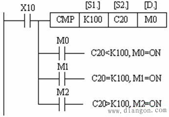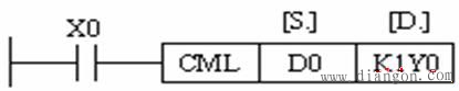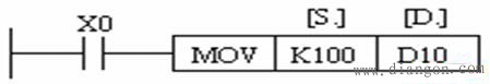 MOV指令将源操作数的数据传送到目标元件中,即[S.]→[D.]。MOV指令的使用说明如图所示。当X0为ON时,源操作数[S.]中的数据K100传送到目标元件D10中。当X0为OFF,指令不执行,数据保持不变。