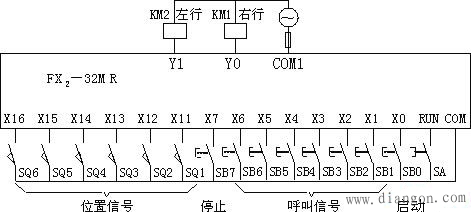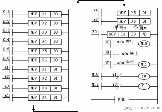 图中将送料车当前位置送到数据寄存器 D0 中,将呼叫工作台号送到数据寄存器 D1 中,然后通过 D0 与 D1 中数据的比较,决定送料车的运行方向和到达的目标位置。