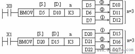 BMOV指令是从源操作数指定的元件开始的n个数组成的数据块传送到指定的目标。如果元件号超出允许的元件号范围,数据仅传送到允许的范围内。BMOV指令的使用说明如图所示。