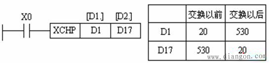 XCH指令是将两个目标元件D1和D2的内容相互交换。使用说明如图所示。